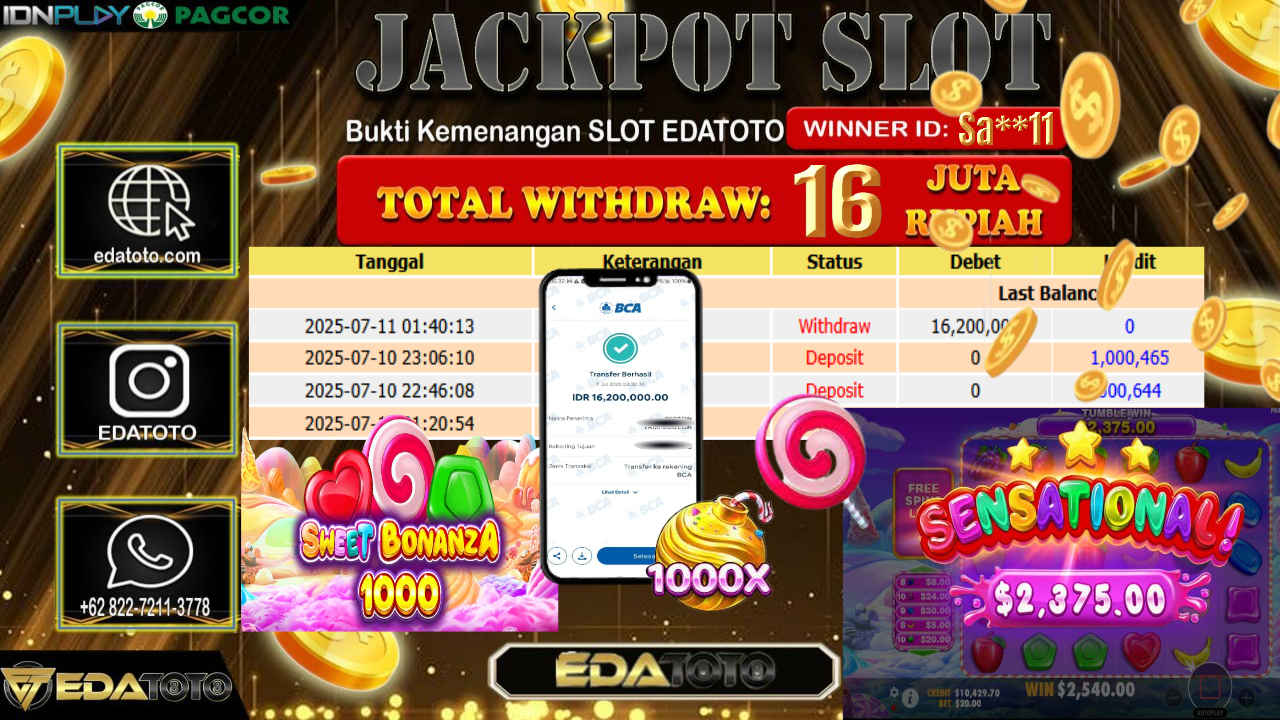 Selamat Kepada Pemilik user ID : Sa**11 Hari/Tanggal : Jumat/ 11, Juli 2025 Jackpot : Rp. 16.200.000 JT Permainan . . .