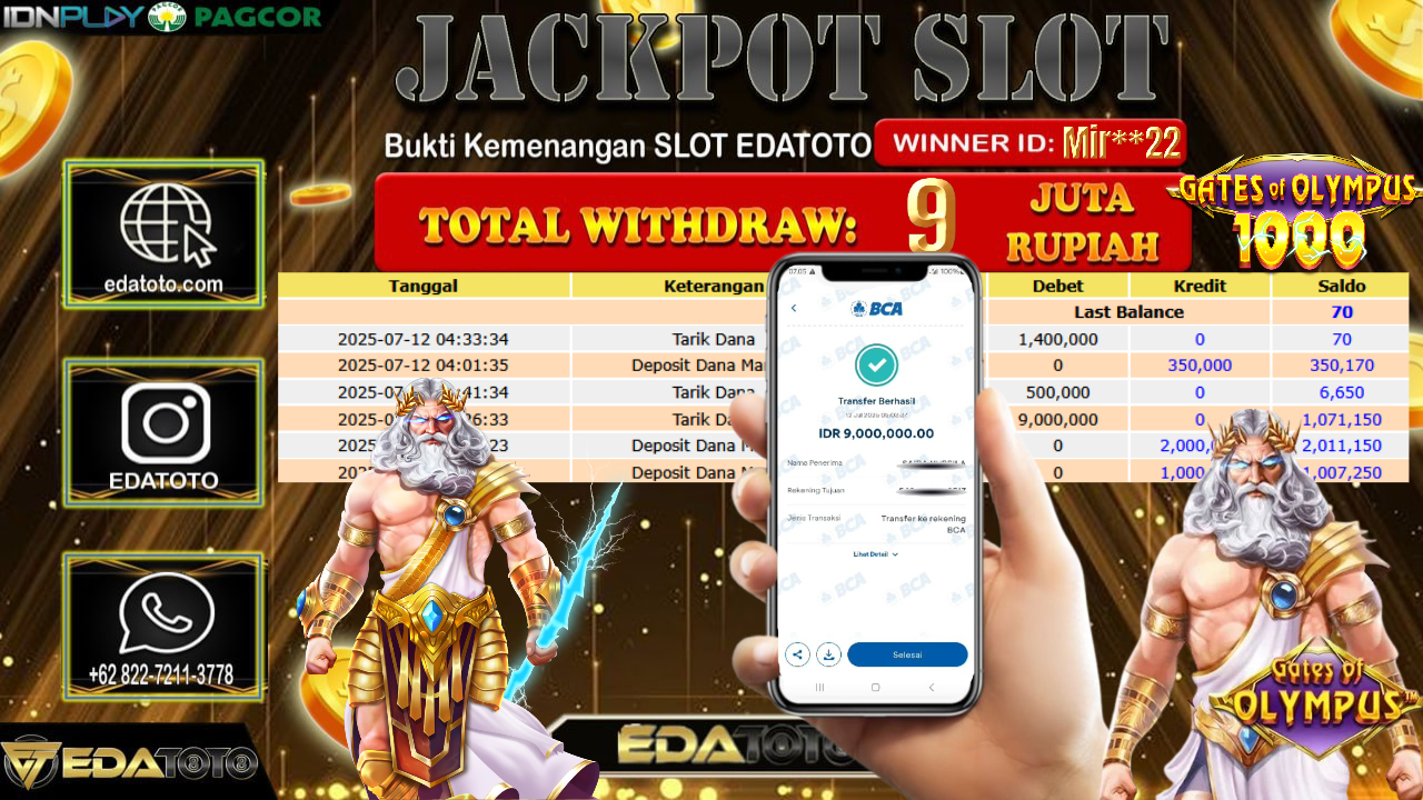 Selamat Kepada Pemilik user ID : Mir**22 Hari/Tanggal : Sabtu/ 12, Juli 2025 Jackpot : Rp. 9.000.000 JT . . .