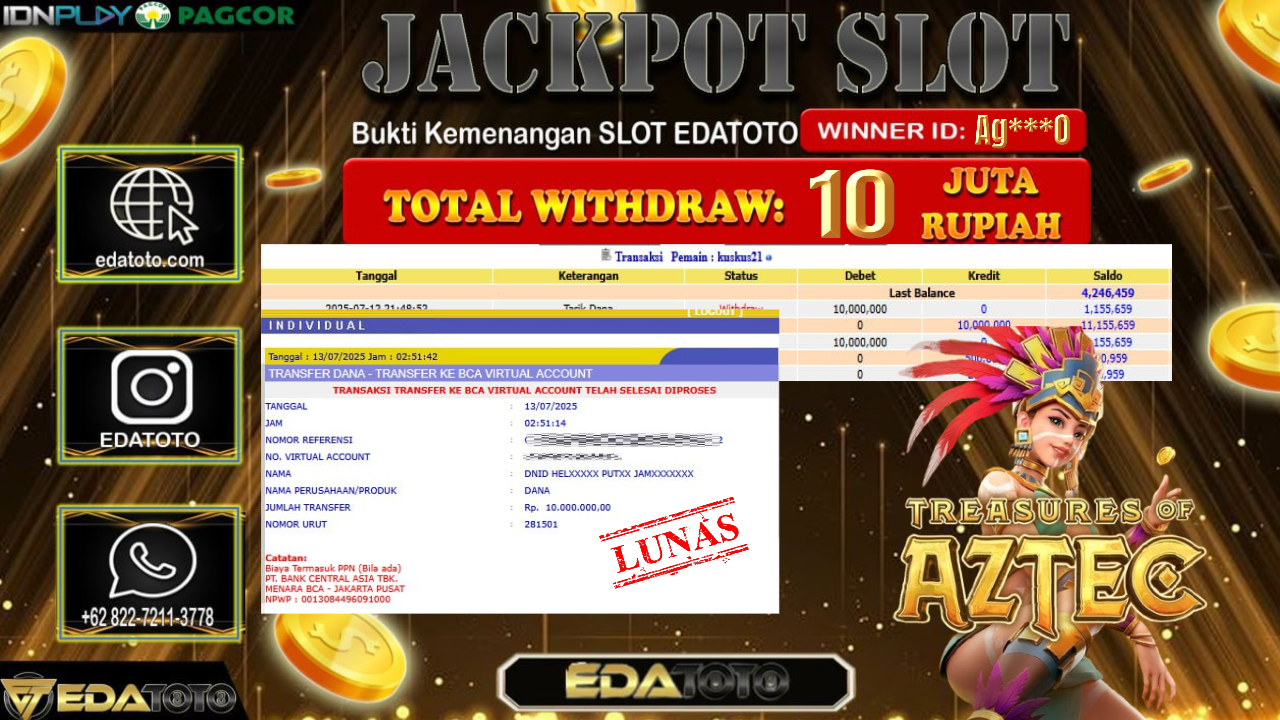 Selamat Kepada Pemilik user ID : Ag***0 Hari/Tanggal : Minggu/ 13, Juli 2025 Jackpot : Rp. 10.000.000 JT Permainan . . .