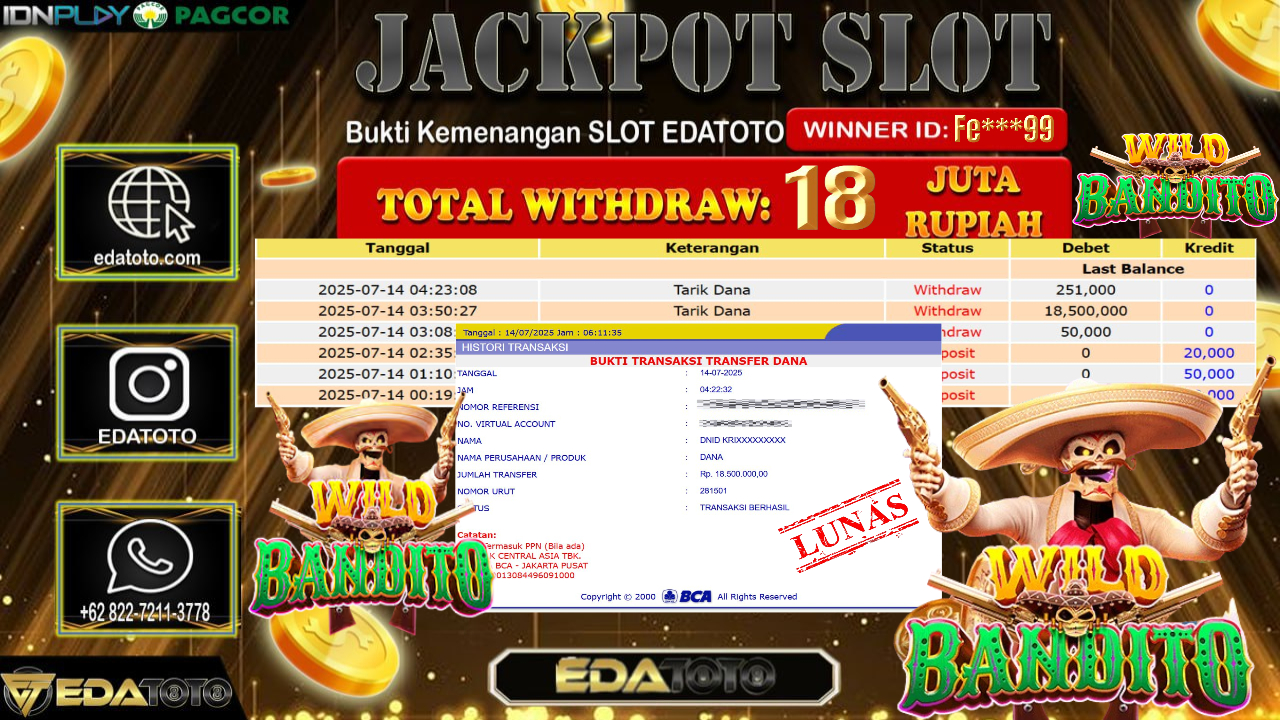 Selamat Kepada Pemilik user ID : Fe***99 Hari/Tanggal : Senin/ 14, Juli 2025 Jackpot : Rp. 18.500.000 JT Permainan . . .