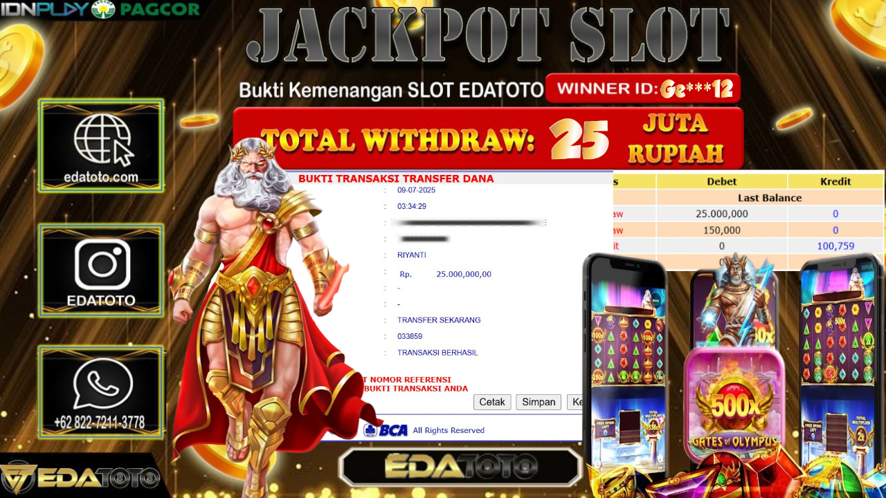 Selamat Kepada Pemilik user ID : Ge***12 Hari/Tanggal : Rabu/ 09, Juli 2025 Jackpot : Rp. 25.000.000 JT Permainan : GATES . . .