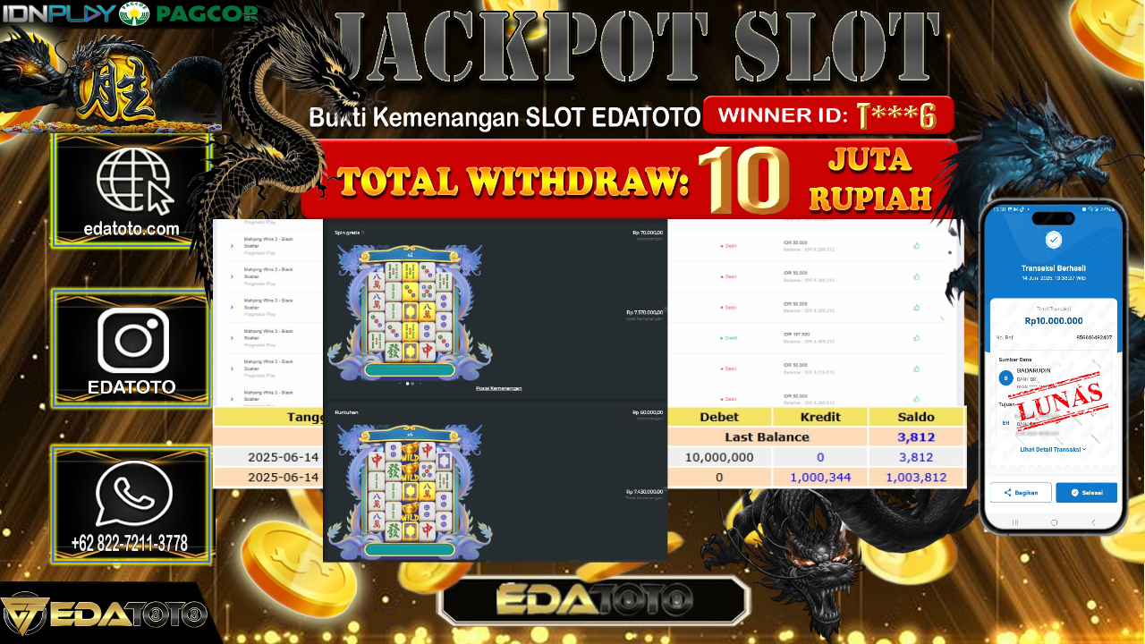 Selamat Kepada Pemilik user ID : T***1 Hari/Tanggal : Senin/ 16, Juni 2025 Jackpot : Rp. 10.000.000 JT Permainan : . . .