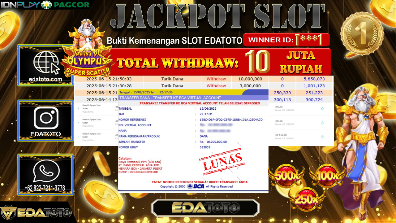 Selamat Kepada Pemilik user ID : T***6 Hari/Tanggal : Minggu/ 15, Juni 2025 Jackpot : Rp. 10.000.000 JT Permainan : . . .