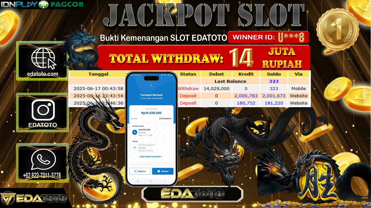 Selamat Kepada Pemilik user ID : U***8 Hari/Tanggal : Selasa/ 17, Juni 2025 Jackpot : Rp. 14.029.000 JT Permainan : . . .