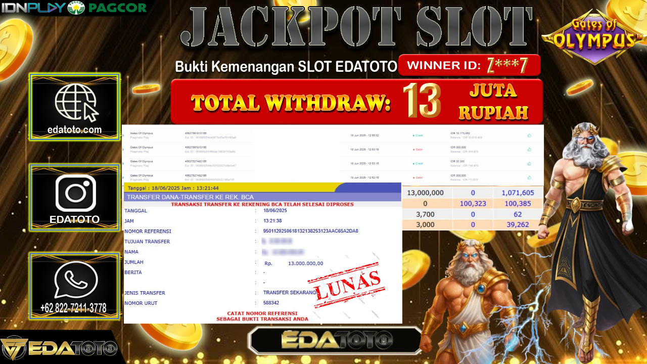 Selamat Kepada Pemilik user ID : Z***7 Hari/Tanggal : Kamis/ 19, Juni 2025 Jackpot : Rp. 13.000.000 JT Permainan : . . .