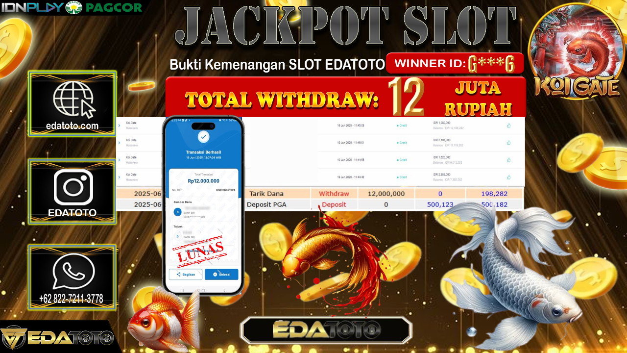 Selamat Kepada Pemilik user ID : G***6 Hari/Tanggal : Jum’at/ 20, Juni 2025 Jackpot : Rp. 12.000.000 JT Permainan : Koi . . .