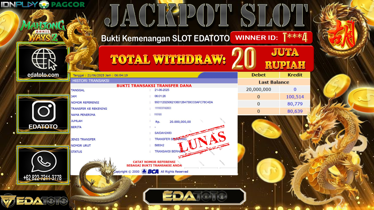 Selamat Kepada Pemilik user ID : T***4 Hari/Tanggal : Sabtu/ 21, Juni 2025 Jackpot : Rp. 20.000.000 JT Permainan : Mahjong . . .