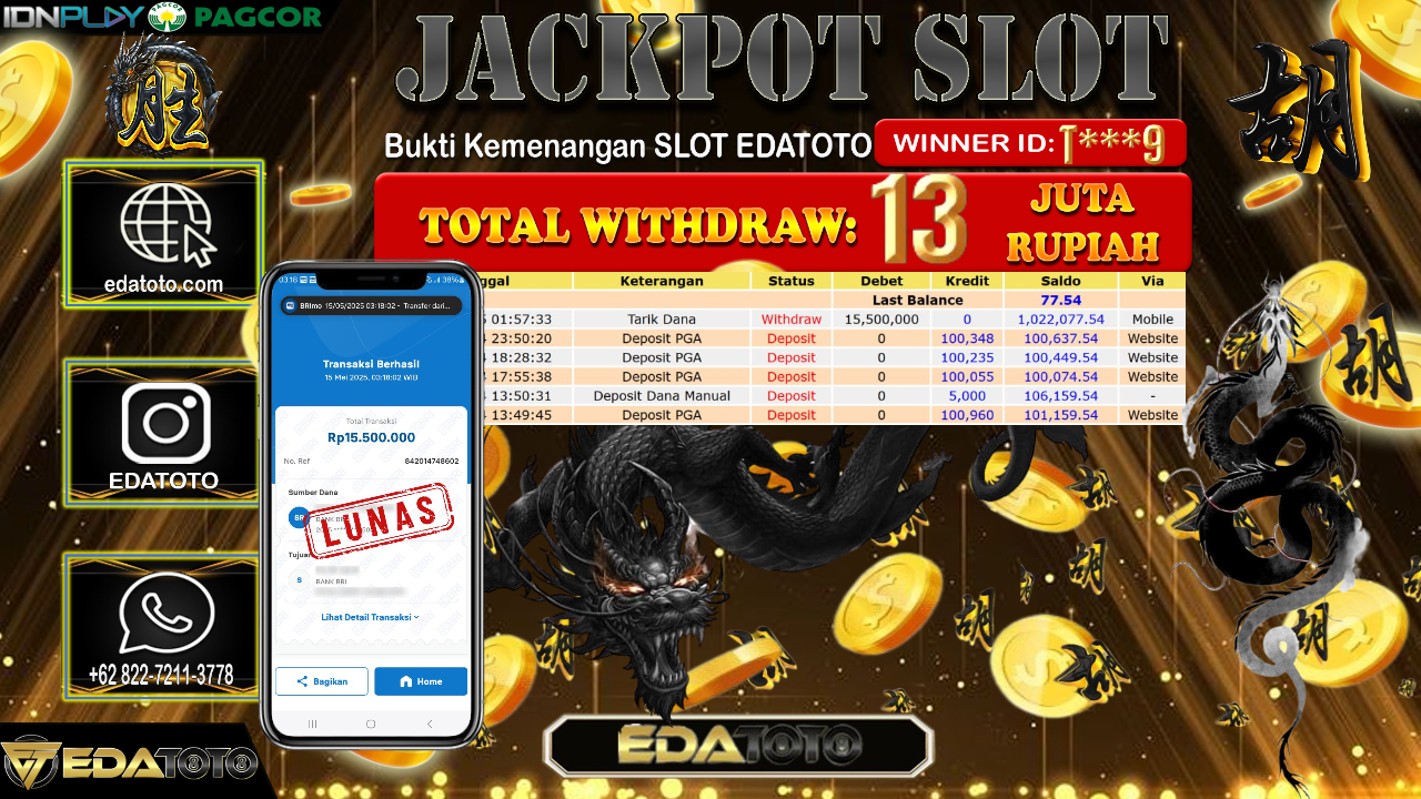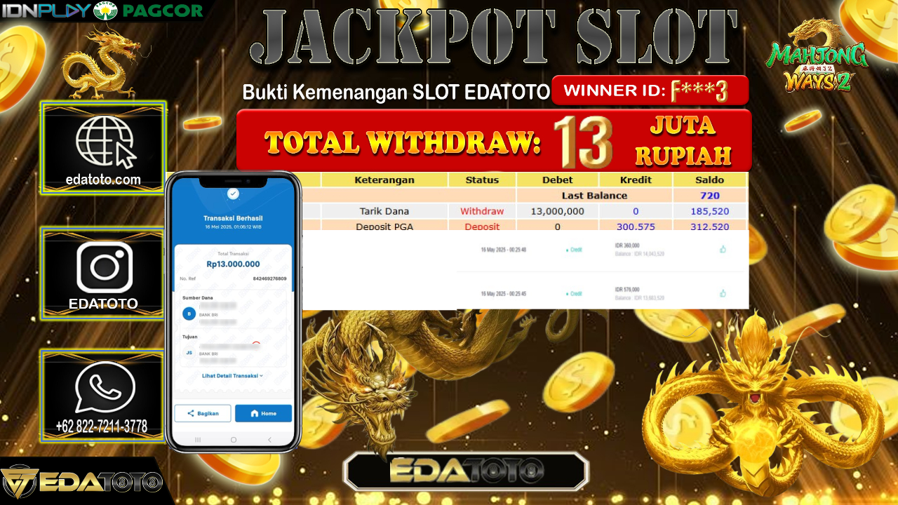 Selamat Kepada Pemilik user ID : T***9 Hari/Tanggal : Kamis/ 15, Mei 2025 Jackpot : Rp. 13.000.000 JT Permainan : Mahjong . . .