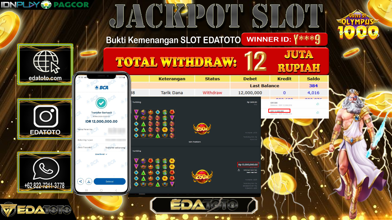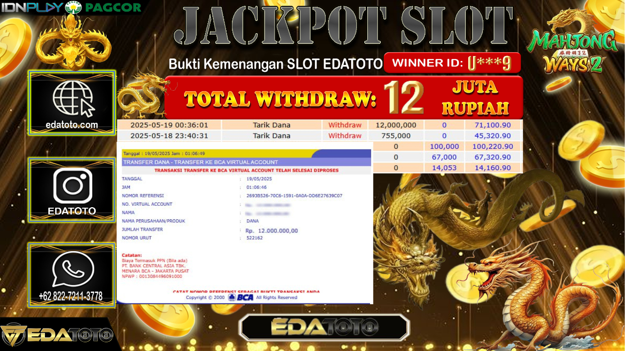 Selamat Kepada Pemilik user ID : Y***9 Hari/Tanggal : Jum’at/ 16, Mei 2025 Jackpot : Rp. 12.000.000 JT Permainan . . .