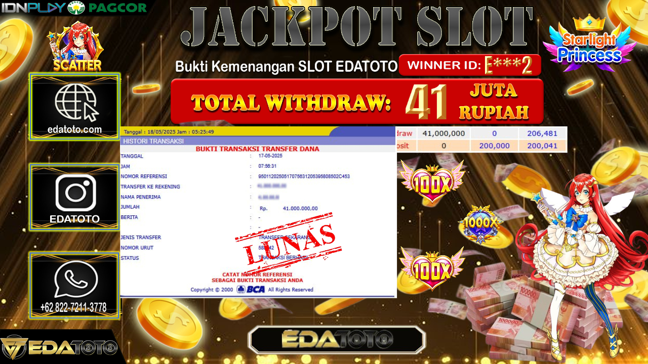 Selamat Kepada Pemilik user ID : E***2 Hari/Tanggal : Minggu/ 18, Mei 2025 Jackpot : Rp. 41.000.000 JT Permainan . . .