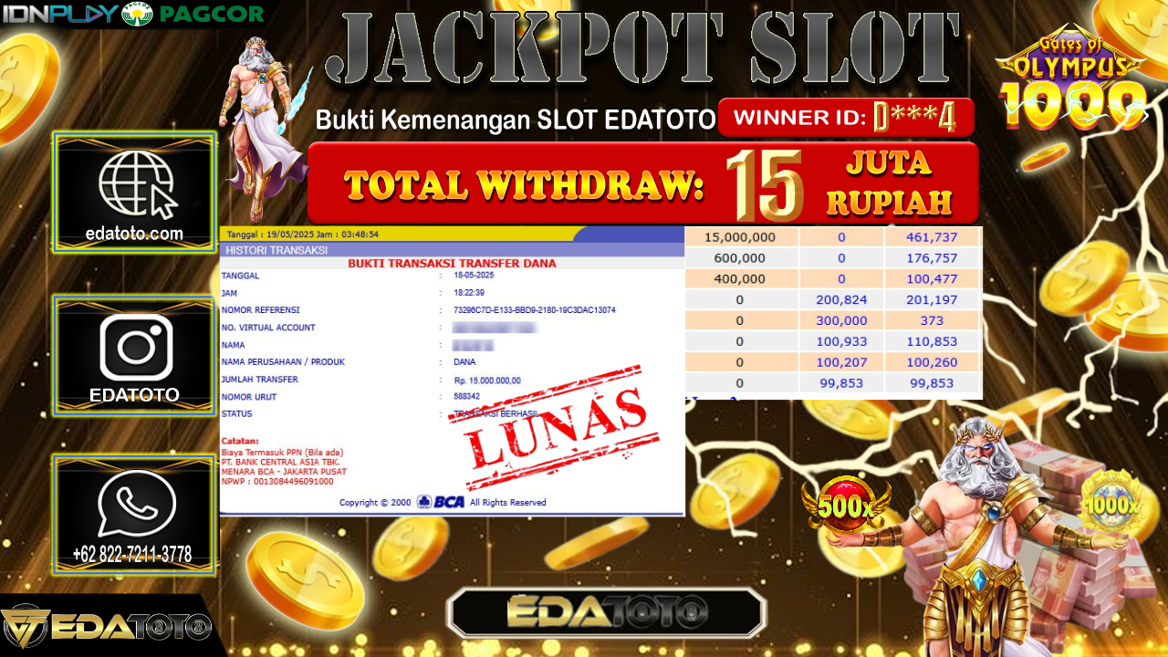 Selamat Kepada Pemilik user ID : D***4 Hari/Tanggal : Senin/ 19, Mei 2025 Jackpot : Rp. 15.000.000 JT Permainan . . .