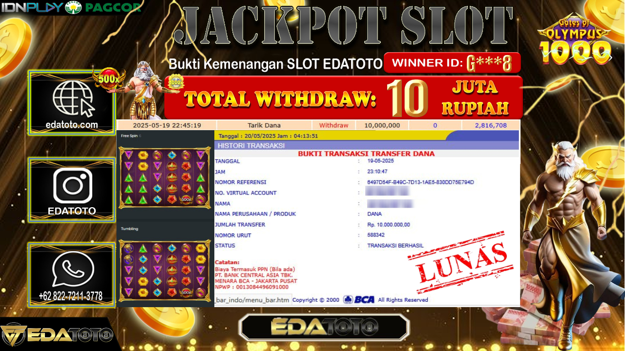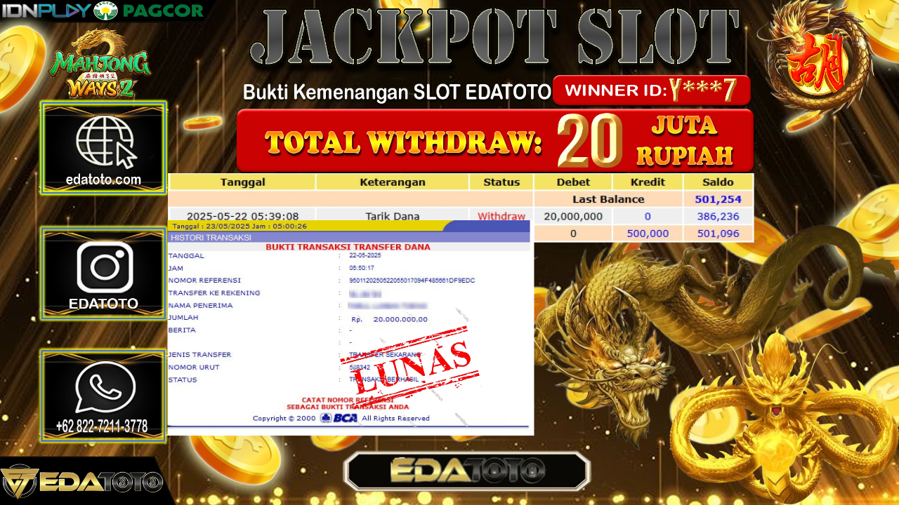 Selamat Kepada Pemilik user ID : Y***7 Hari/Tanggal : Jum’at/ 23, Mei 2025 Jackpot : Rp. 20.000.000 JT Permainan . . .