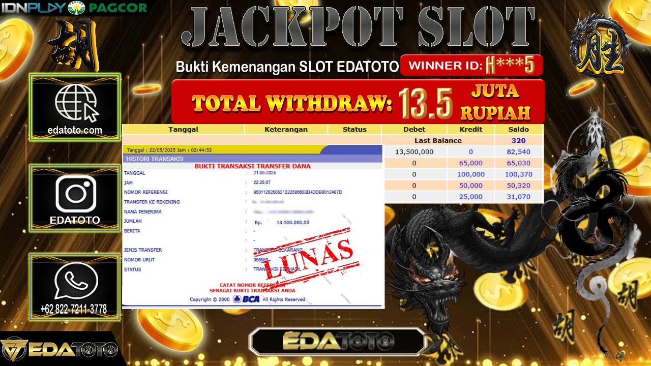Selamat Kepada Pemilik user ID : H***5 Hari/Tanggal : Kamis/ 22, Mei 2025 Jackpot : Rp. 13.500.000 JT Permainan . . .