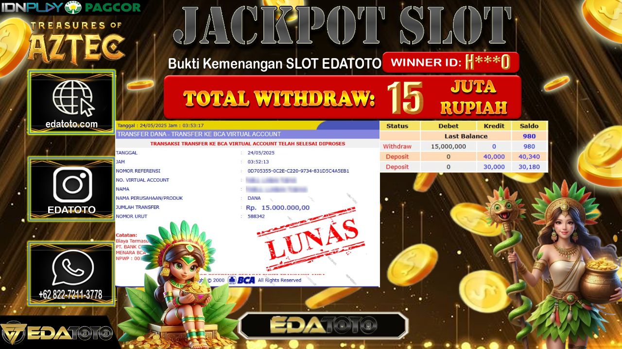 Selamat Kepada Pemilik user ID : H***0 Hari/Tanggal : Sabtu/ 24, Mei 2025 Jackpot : Rp. 15.000.000 JT Permainan : Treasures . . .