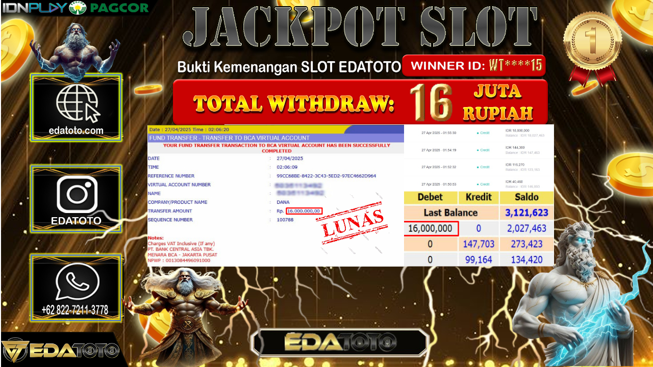 Selamat Kepada Pemilik user ID : WT****88 Hari/Tanggal : Minggu / 27 , April 2025 Jackpot : Rp. 16.000.000 JT Permainan . . .