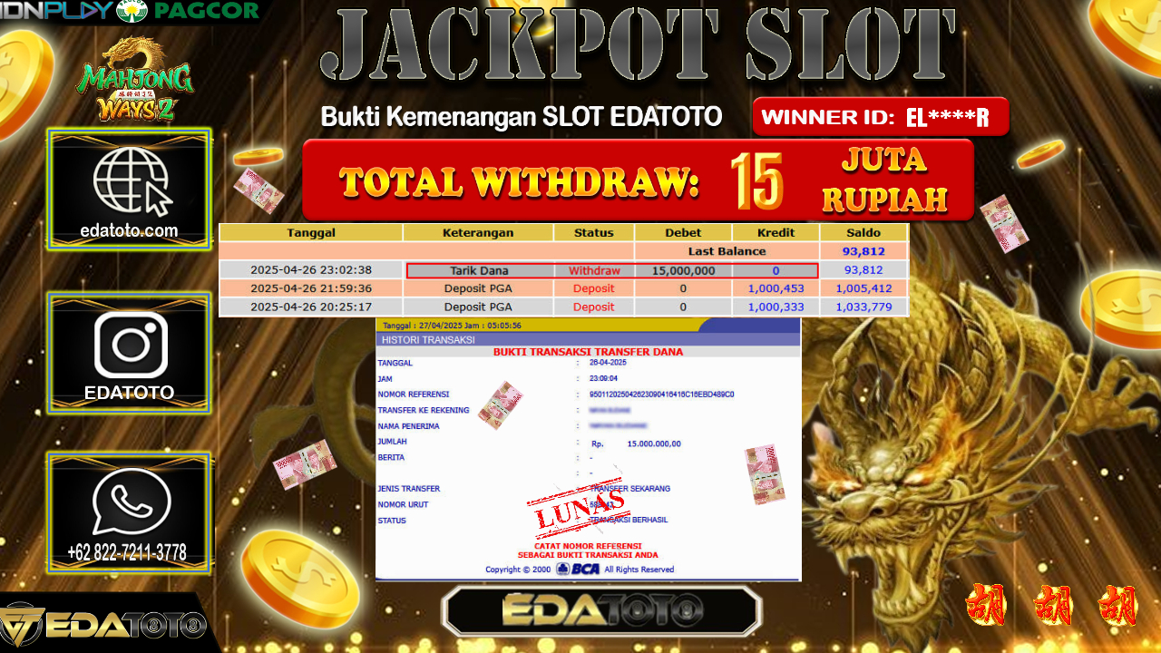 Selamat Kepada Pemilik user ID : EL****R Hari/Tanggal : Minggu / 27, April 2025 Jackpot : Rp. 15.000.000 JT Permainan : MAHJONG . . .