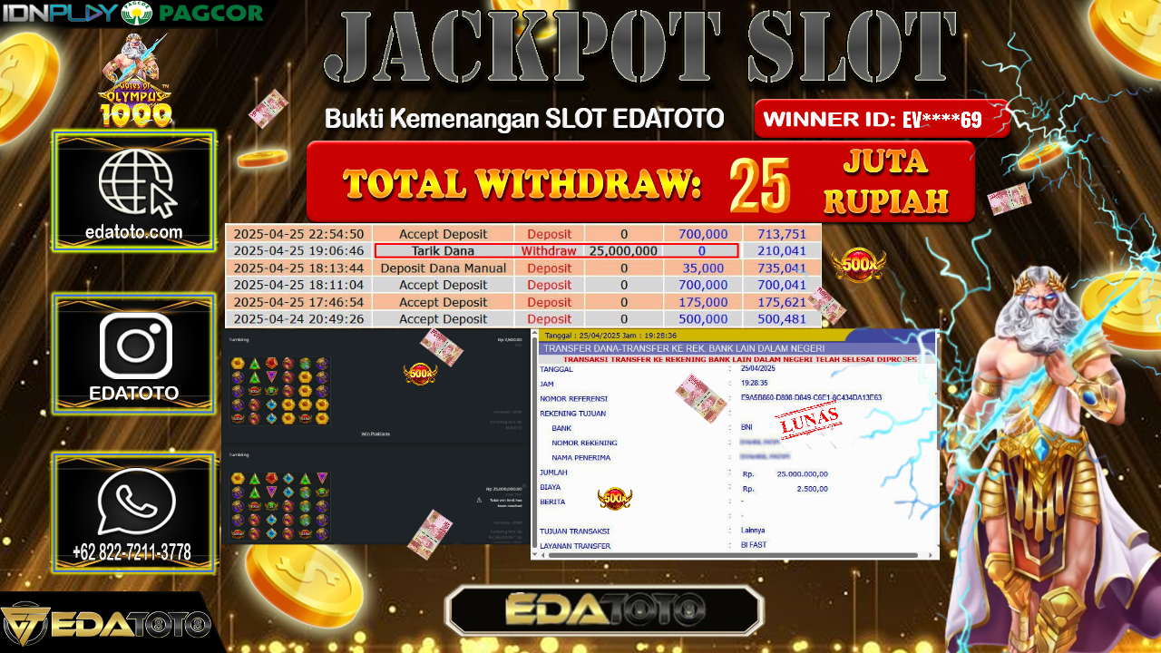 Selamat Kepada Pemilik user ID : EV****69 Hari/Tanggal : Sabtu / 26 , April 2025 Jackpot : Rp. 25.000.000 JT Permainan . . .
