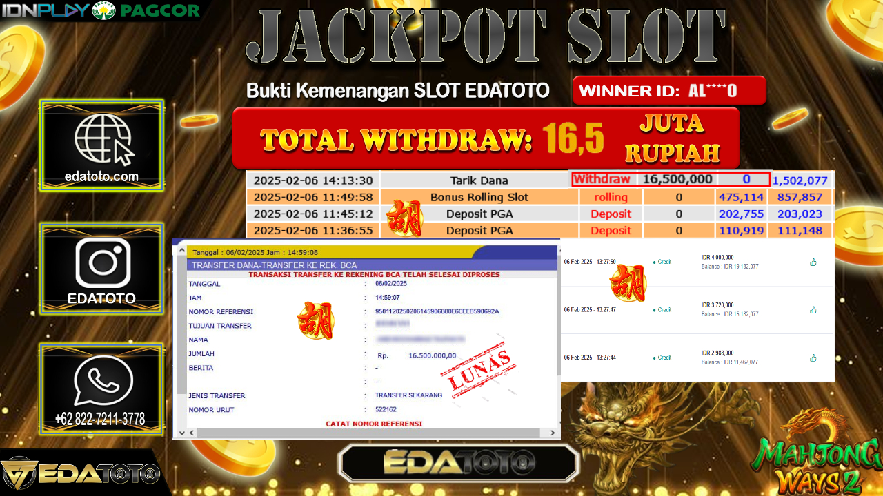 Selamat Kepada Pemilik user ID : AL****0 Hari/Tanggal : Jumat / 07 , FEBRUARY 2025 Jackpot : Rp. 16.500.000 JT . . .