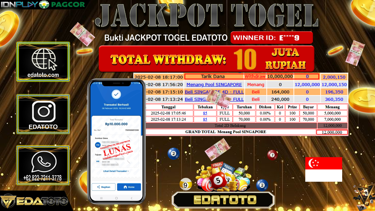 Selamat Kepada Pemilik user ID : E****9 Hari/Tanggal : Minggu/ 09 , FEBRUARY 2025 Jackpot : Rp. 15.000.000 JT Permainan . . .