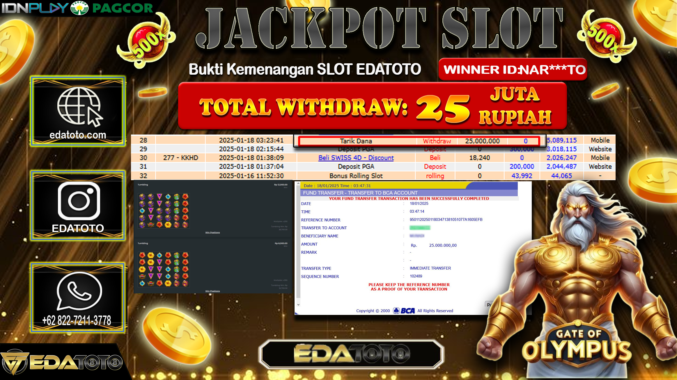 Selamat Kepada Pemilik user ID :  NAR***TO Hari/Tanggal : SENIN / 20 , JANUARY 2025 Jackpot : Rp. 25.000.000 JT . . .