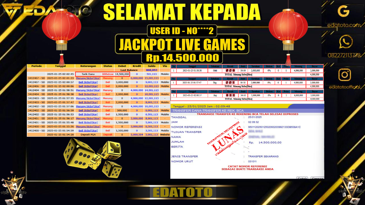 Selamat Kepada Pemilik user ID : NO****2 Hari/Tanggal : Sabtu / 25 , JANUARY 2025 Jackpot : Rp. 14.500.000 JT . . .