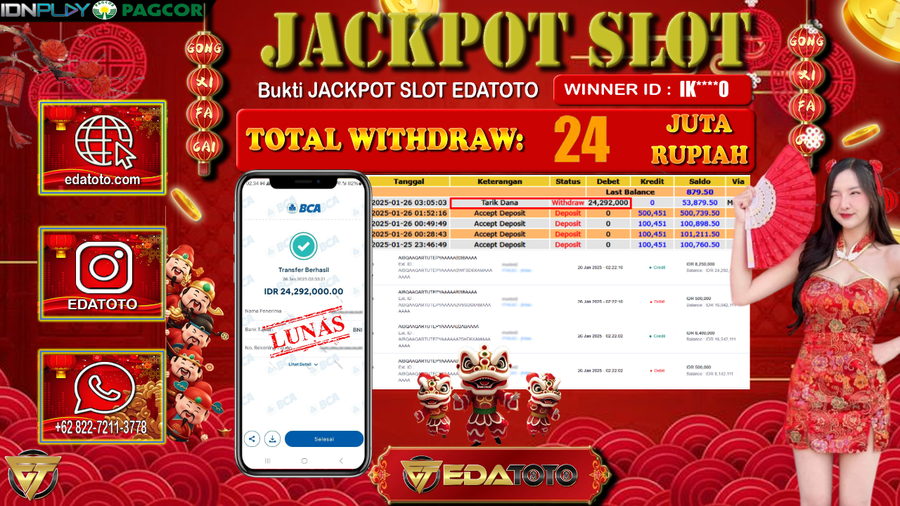 Selamat Kepada Pemilik user ID : IK***0 Hari/Tanggal : Minggu / 25 , JANUARY 2025 Jackpot : Rp. 24.292.000 JT . . .