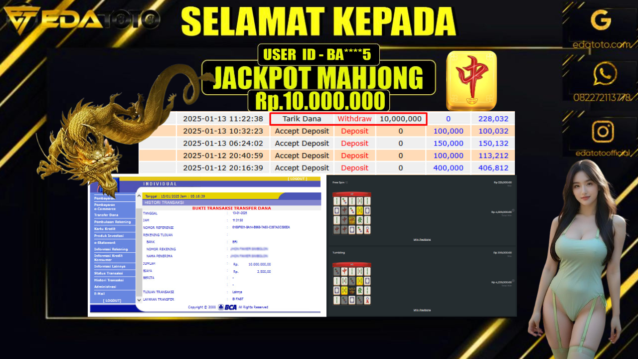 Selamat Kepada Pemilik user ID :  BA****5 Hari/Tanggal : RABU / 15 , JANUARY 2025 Jackpot : Rp. 10.000.000 JT . . .