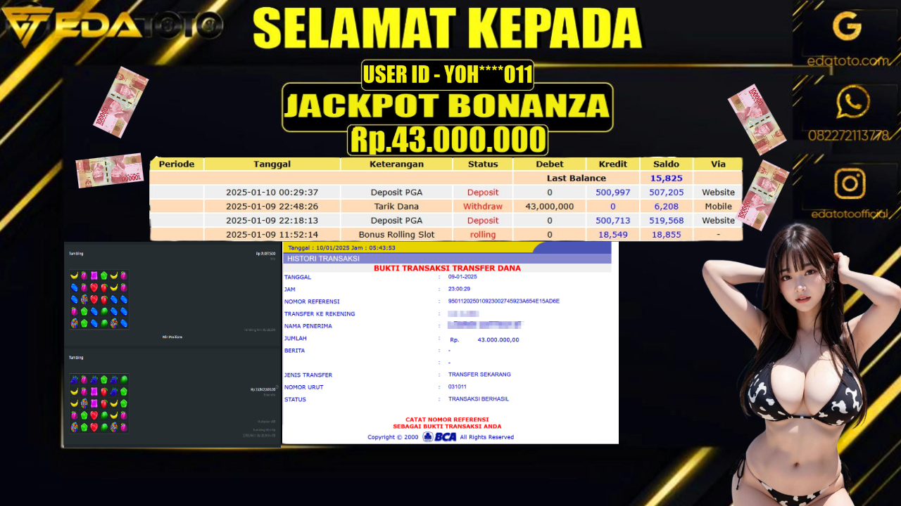 Selamat Kepada Pemilik user ID :  YOH****O11 Hari/Tanggal : JUMAT/ 10 JANUARY 2025 Jackpot : Rp. 43.000.000 JT Permainan : . . .