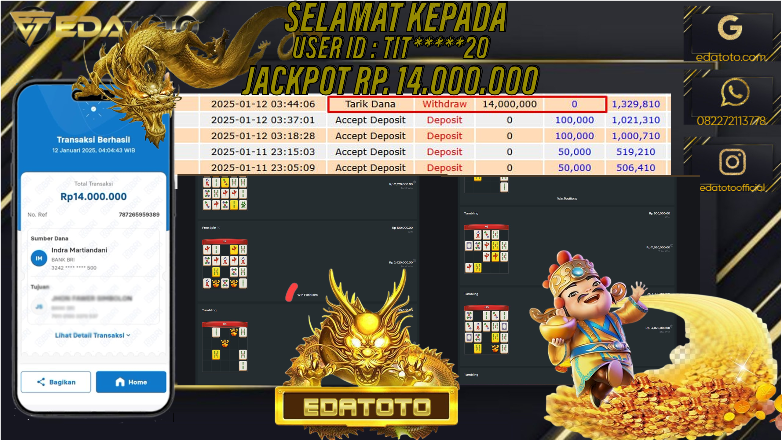 Selamat Kepada Pemilik user ID :  TIT****20 Hari/Tanggal : SENIN / 13  , JANUARY 2025 Jackpot : Rp. 14.000.000 JT . . .