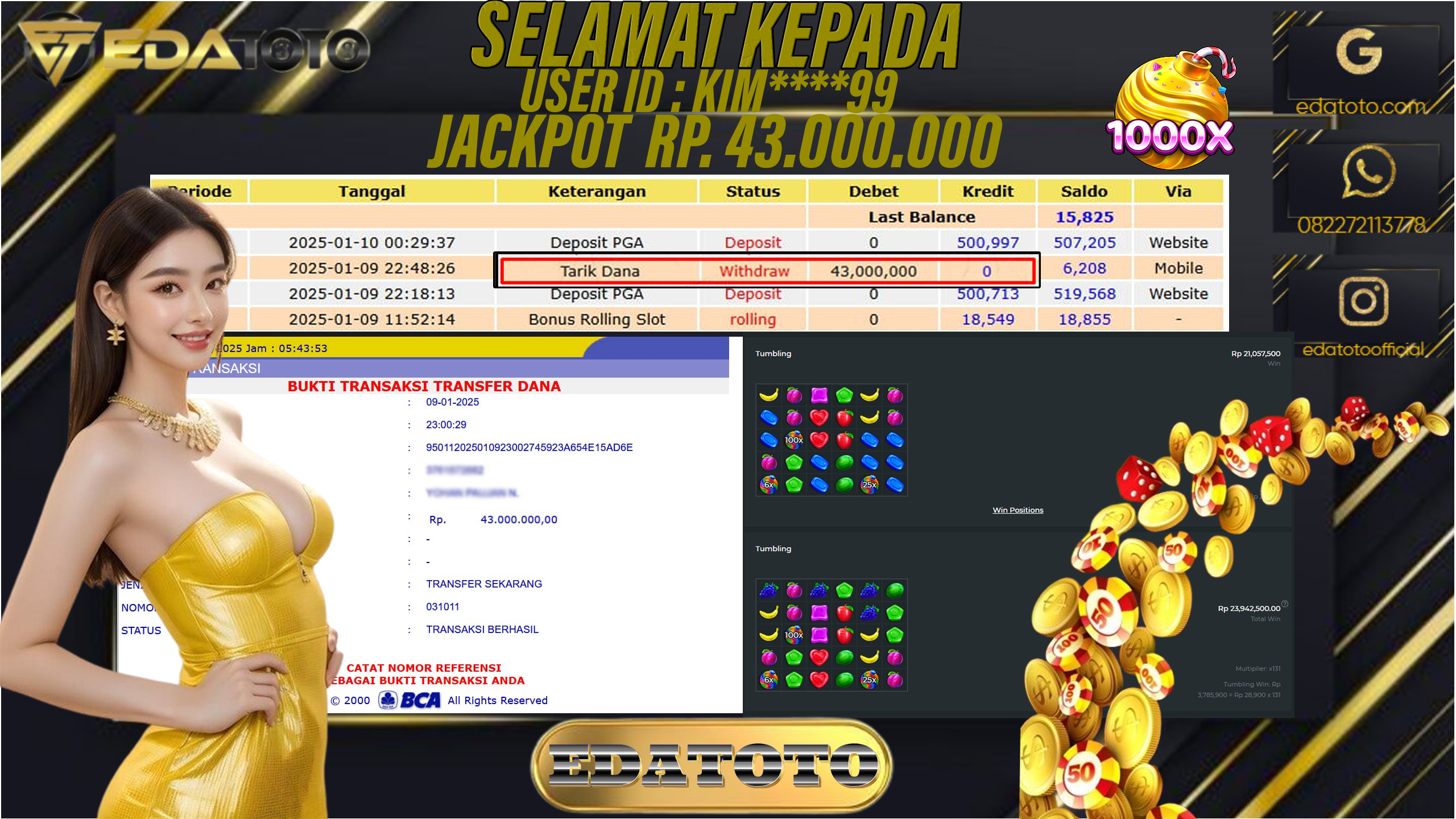 Selamat Kepada Pemilik user ID :  KIM*****99 Hari/Tanggal : SABTU / 11 JANUARY 2025 Jackpot : Rp. 43.000.000 JT . . .