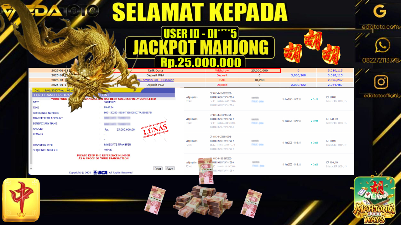Selamat Kepada Pemilik user ID :  DI****5 Hari/Tanggal : MINGGU / 19 , JANUARY 2025 Jackpot : Rp. 25.000.000 JT . . .