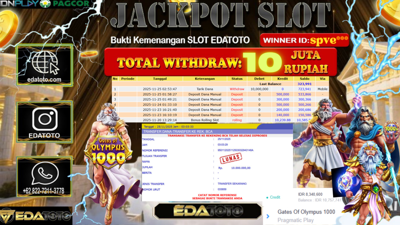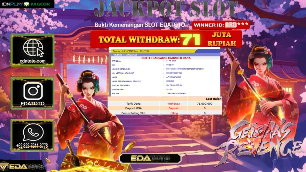 Selamat Kepada Pemilik user ID : ARD*** Hari/Tanggal :Selasa / 27, November 2025 Jackpot : Rp. 85,251,000 JT Withdraw :71,000,000 . . .