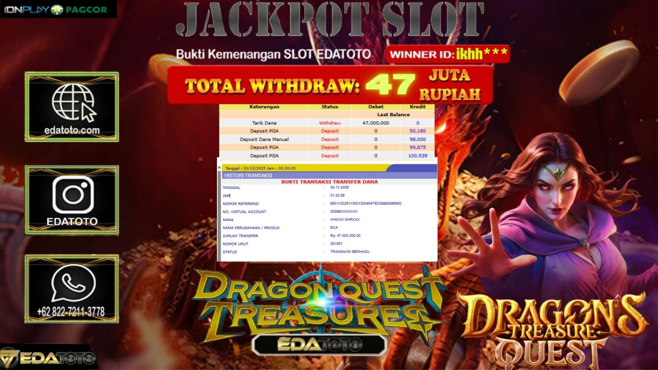 Selamat Kepada Pemilik user ID : IKHH*** Hari/Tanggal :SABTU / 30, November 2025 Jackpot : Rp. 50,300,000 JT Withdraw :47,000,000 . . .