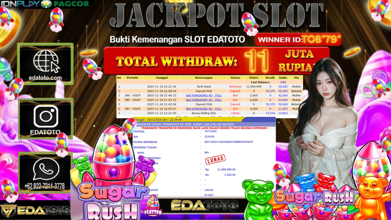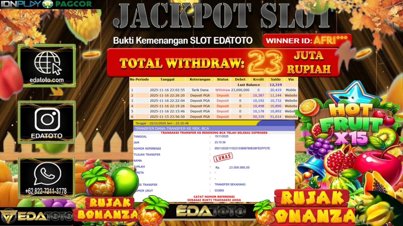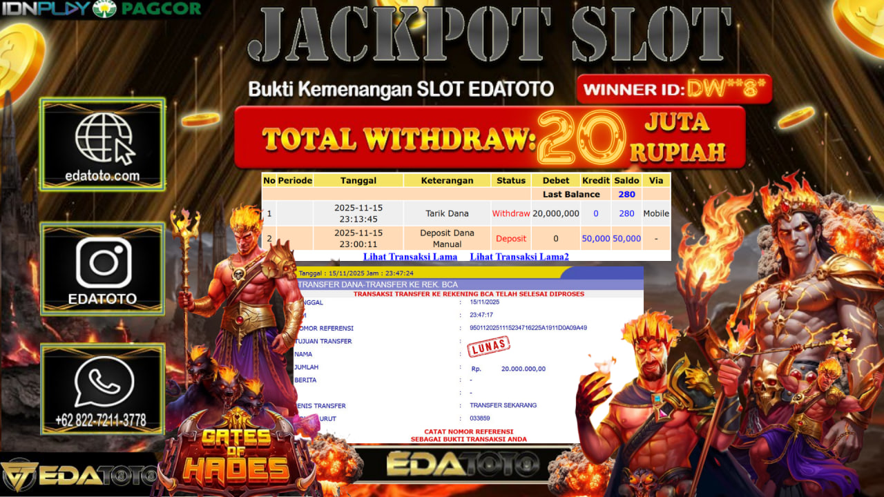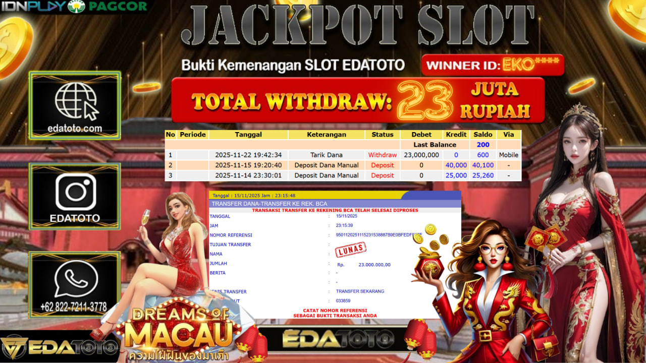 Selamat Kepada Pemilik user ID : EKO**** Hari/Tanggal : Sabtu / 15, November 2025 Jackpot : Rp. 33,120,000 JT Withdraw :23,000,000 . . .